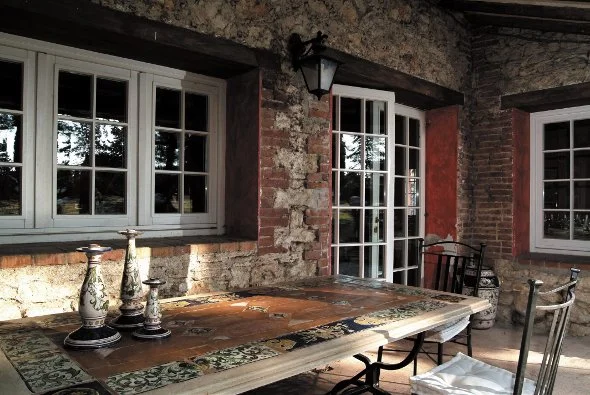 The Antica Deruta type are instead made with Travertine stone with inserts and tiles of ceramics and earthenware. There are base options with matching side & arm chairs.